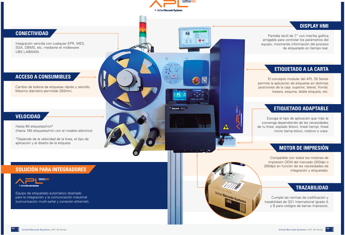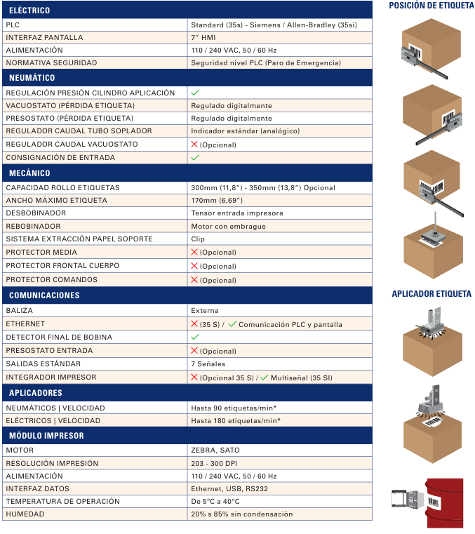 • VELOCIDAD HASTA*: 180 etiquetas/min (APL eléctrico) 90 etiquetas/min (APL neumático) * Depende de la velocidad e integración de la línea, tipo y número de etiquetas aplicadas