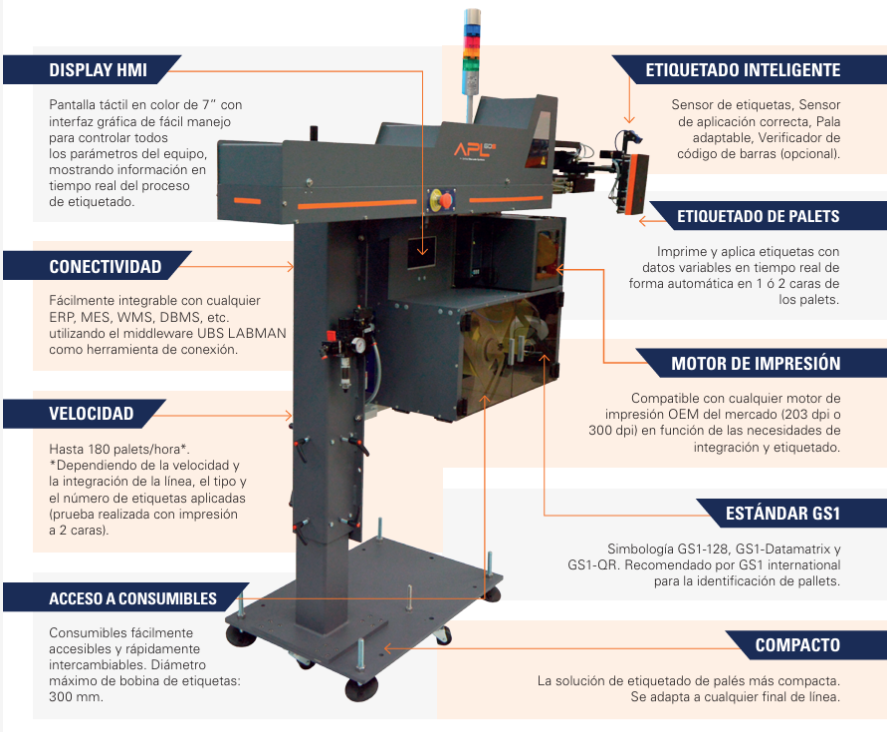 Debido a la complejidad de etiquetado de estos tipos de paletizado, los APL 8000 ELV Series se convierten en el equipo idóneo para las líneas donde se requiera la codificación GS1-128 de palets a diferentes alturas, siguiendo las recomendaciones de GS1 internacional para el etiquetado de palets.